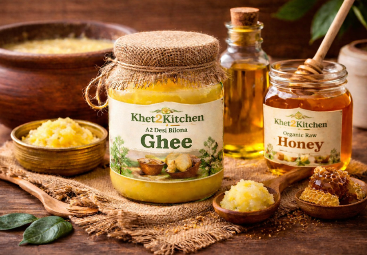 At Khet2Kitchen Organics, we bring thoughtfully prepared kitchen essentials crafted using traditional methods and sourced directly from trusted farmers. From cold pressed oils to A2 Bilona ghee and natural honey, every product reflects authenticity, purity, and uncompromised quality for everyday cooking.